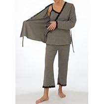 3-piece pajama set. Comfortable stretch cotton. Pretty jacquard pattern. Nursing tank has built-in shelf bra. Easy access one-handed nursing clips. Stretch straps are back adjustable. Stylish long sleeve wrap jacket. Contrasting scalloped lace trim. Capri length pants. Elastic drawstring waistband satin tie. Specifically designed for nursing mothers. La Leche League Intimates Style 4361- Style 4361